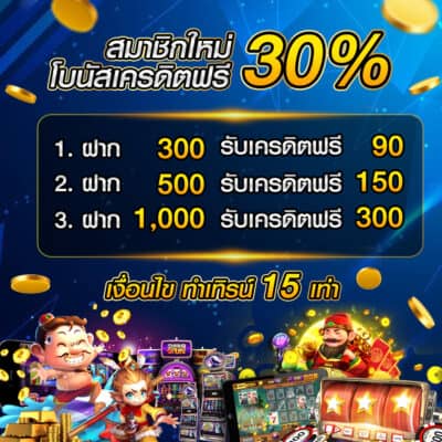 • สมาชิกใหม่ฝากครั้งแรก 1,000 บาท รับโปรโมชั่น 30% ยอดเครดิตรวมเป็น 1,300 บาท เดิมพันเทิร์นโอเวอร์ครบ 13,000 ขึ้นไป ก็ถอนเงินได้ทันที